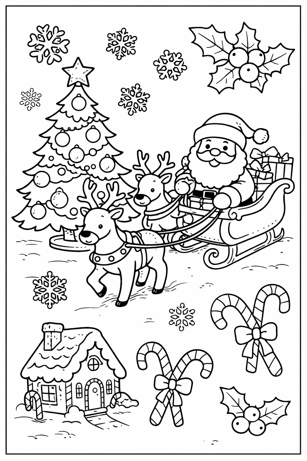 The first coloring page features a cheerful Santa Claus riding his sleigh, filled with wrapped presents and guided by his reindeer. Santa’s friendly face, fluffy beard, and festive hat make this page instantly joyful.