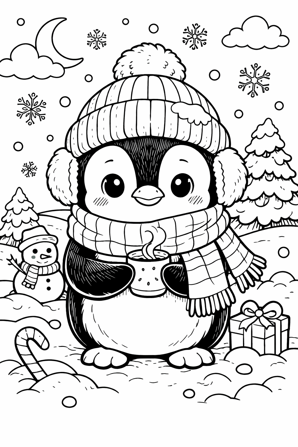 This penguin is dressed for winter fun, wearing a cozy scarf and standing in a snowy background. It’s a great seasonal coloring page, especially for winter, Christmas, or holiday-themed activities.