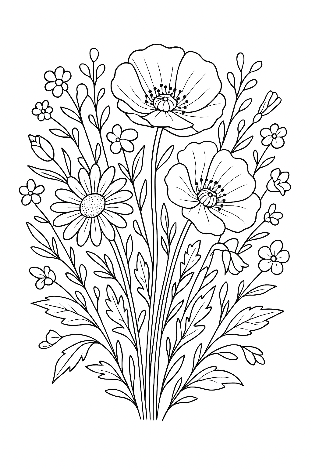 This design combines elegant poppies with cheerful daisies. The long stems and large petals allow for shading practice or bold flat coloring, depending on your style.
