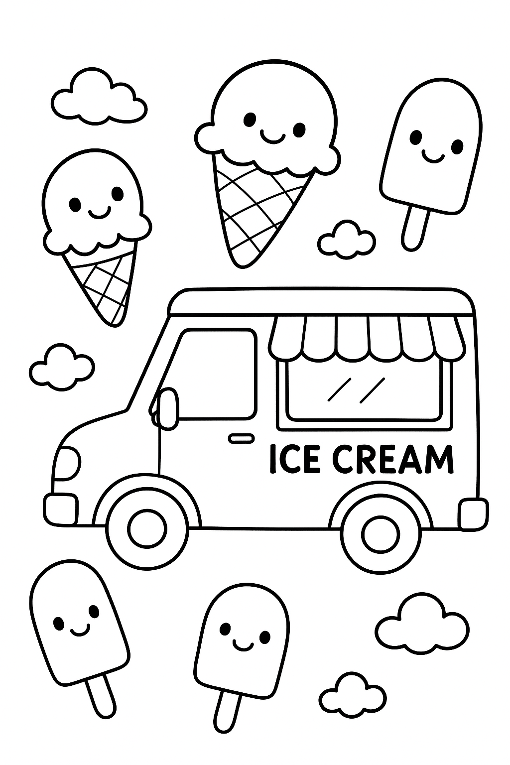Ice Cream truck coloring pages free printable capture that excitement with fun designs like smiling ice cream cones, cute popsicles, friendly ice cream trucks, and playful summer scenes. Kids love characters with faces, simple shapes, and bold outlines that make coloring easy and confident.